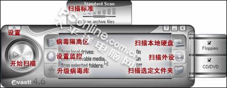 如图六中的注释,选择你需要扫描的文件夹,或者选择全局扫描,并对扫描的标准进行设置:快速,标准,彻底三种。另外还可以勾选扫描日志文件。Avast!的扫描速度很快,查找病毒的能力也十分的强。
